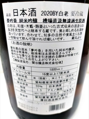 | 商品説明 | 麹協力:関谷醸造様 精米歩合55% アルコール度数‥16度 日本酒度・・+5 酸度1.7 アミノ酸度・・1.2 酵母・・協会1401号 仕込水・・知多湧水 |