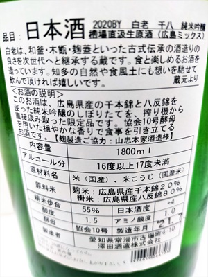 白老 千本錦 純米吟醸 槽場直汲み無濾過生原酒 2020BY 1800ml