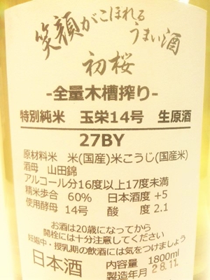 初桜 純米 晴(はれ) 生原酒 27BY 1800ml