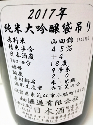 「大治郎 純米大吟醸 袋吊り 生原酒 2017年」は滋賀県産「山田錦」を100%使用。